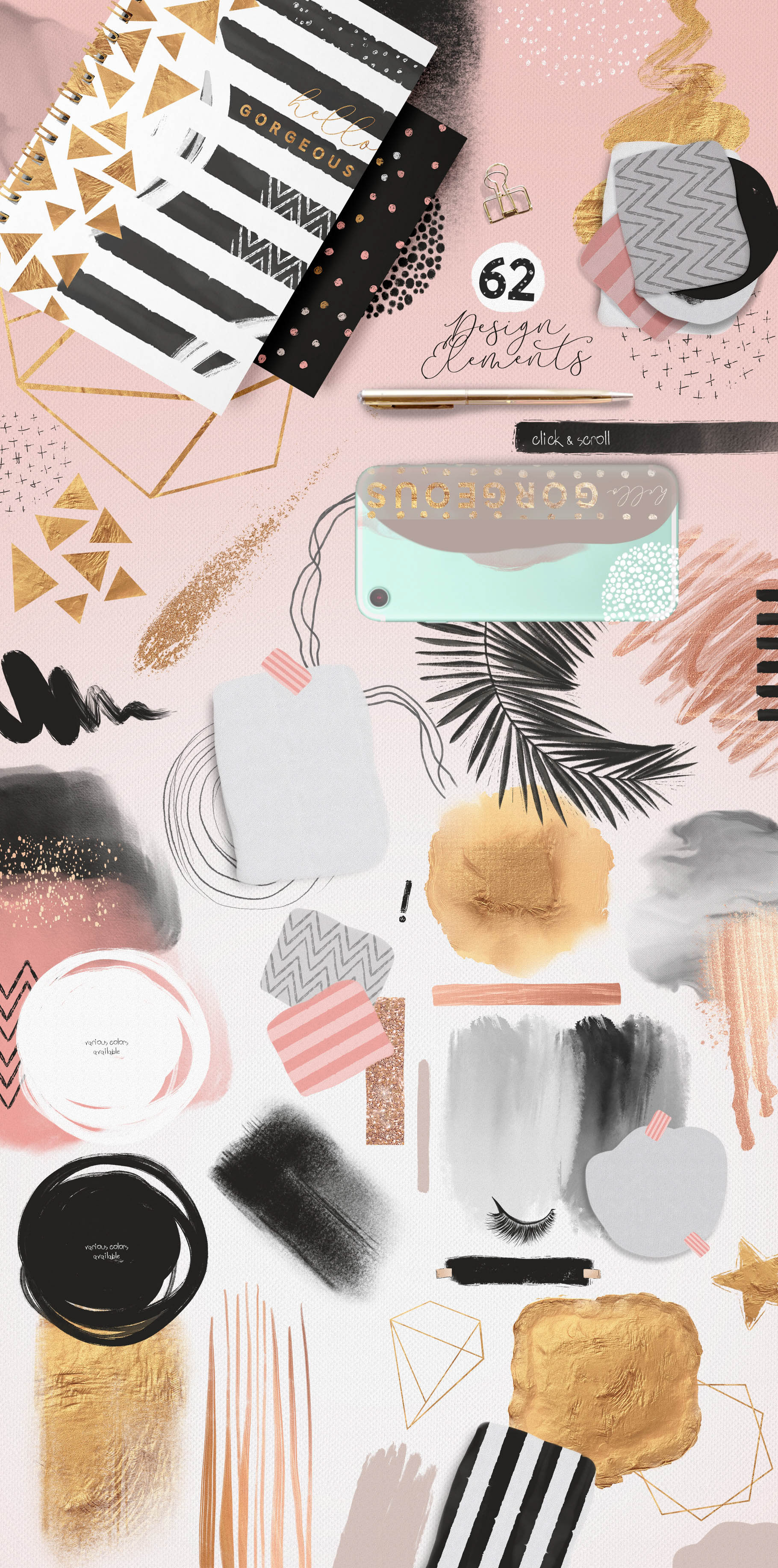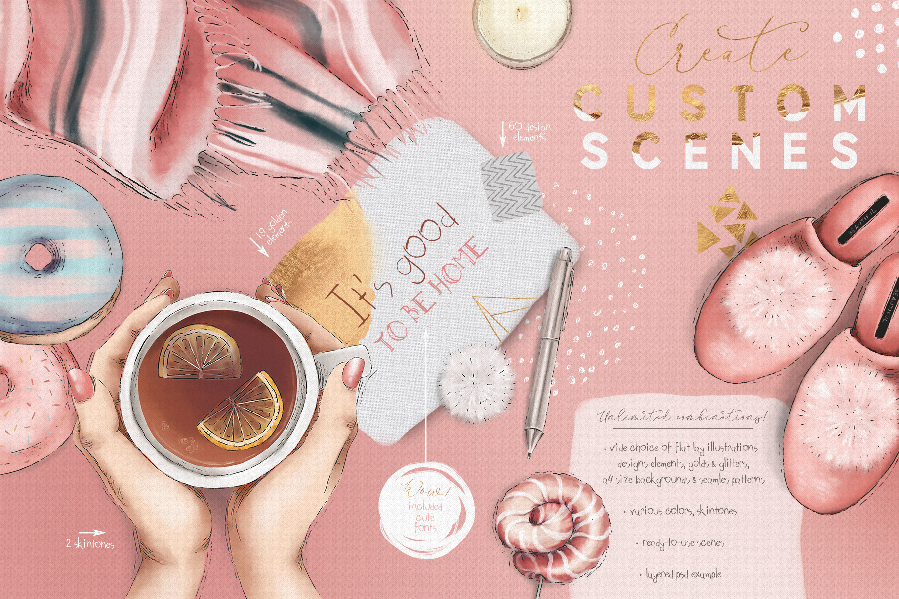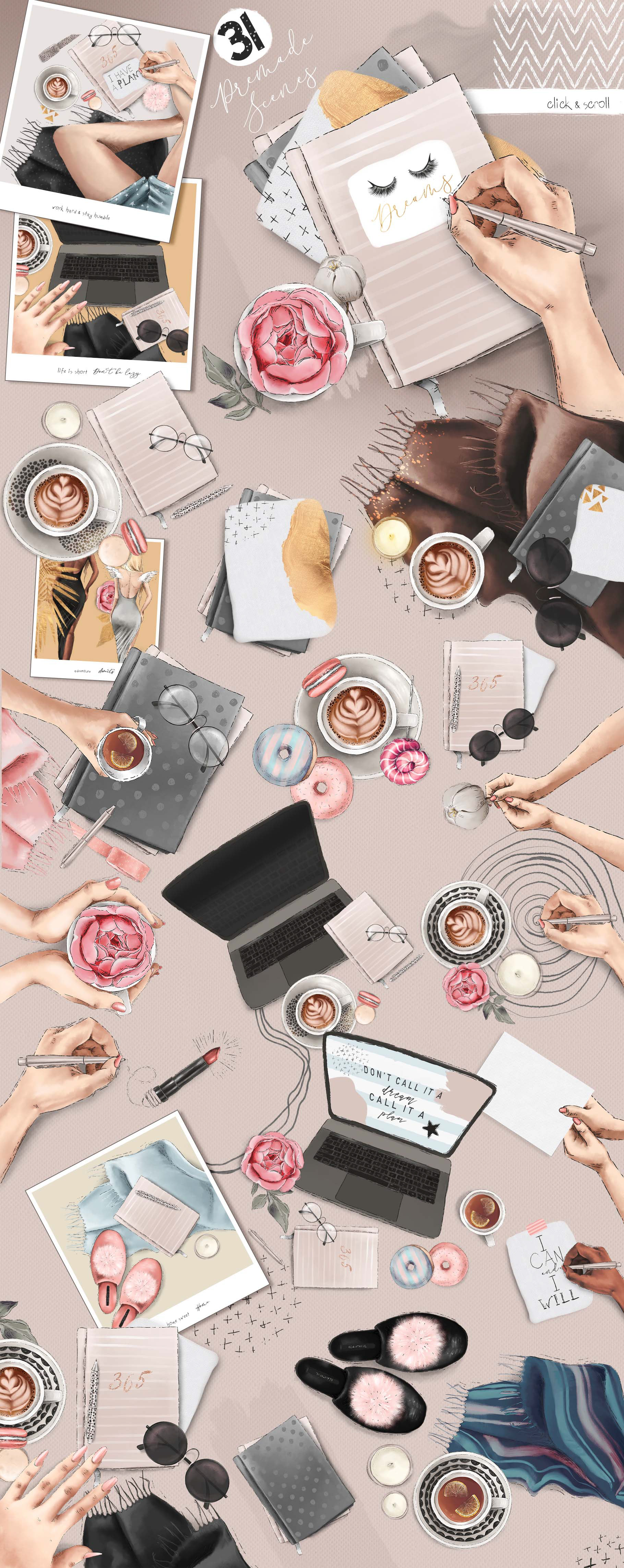 Collection of unique illustrations, design elements, pre-made scenes, patterns & backgrounds, fonts and more!