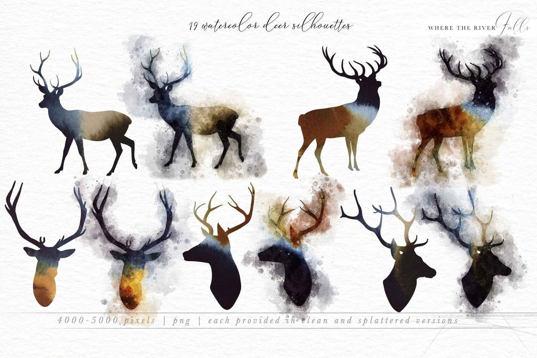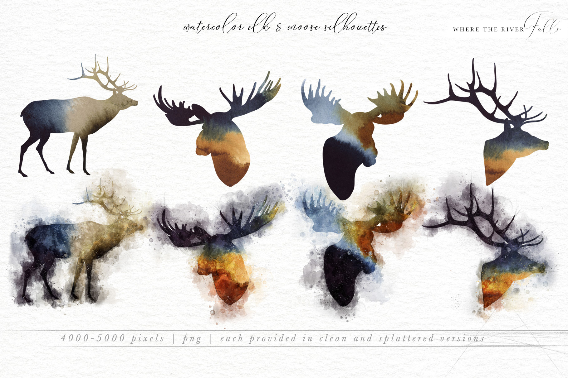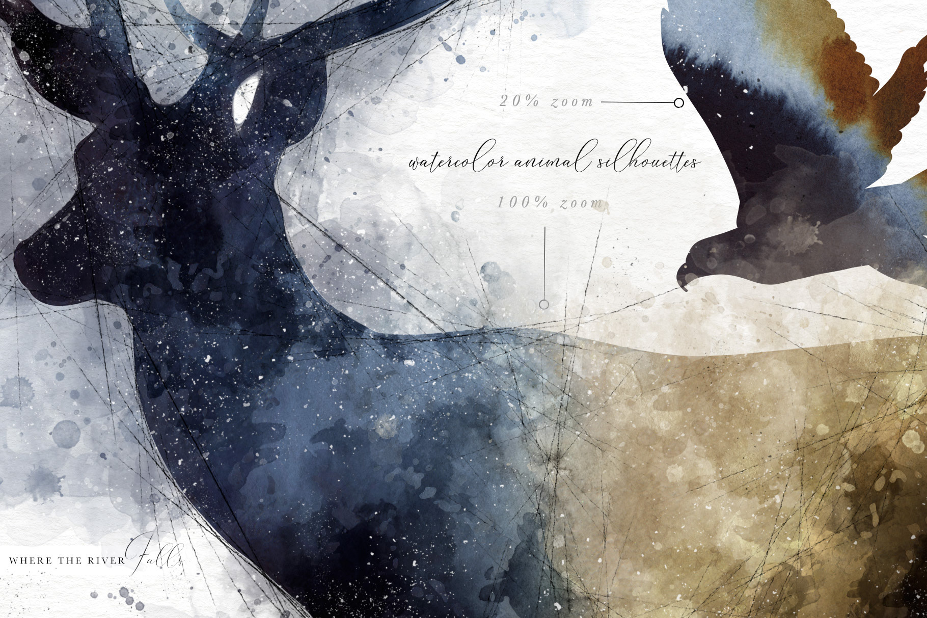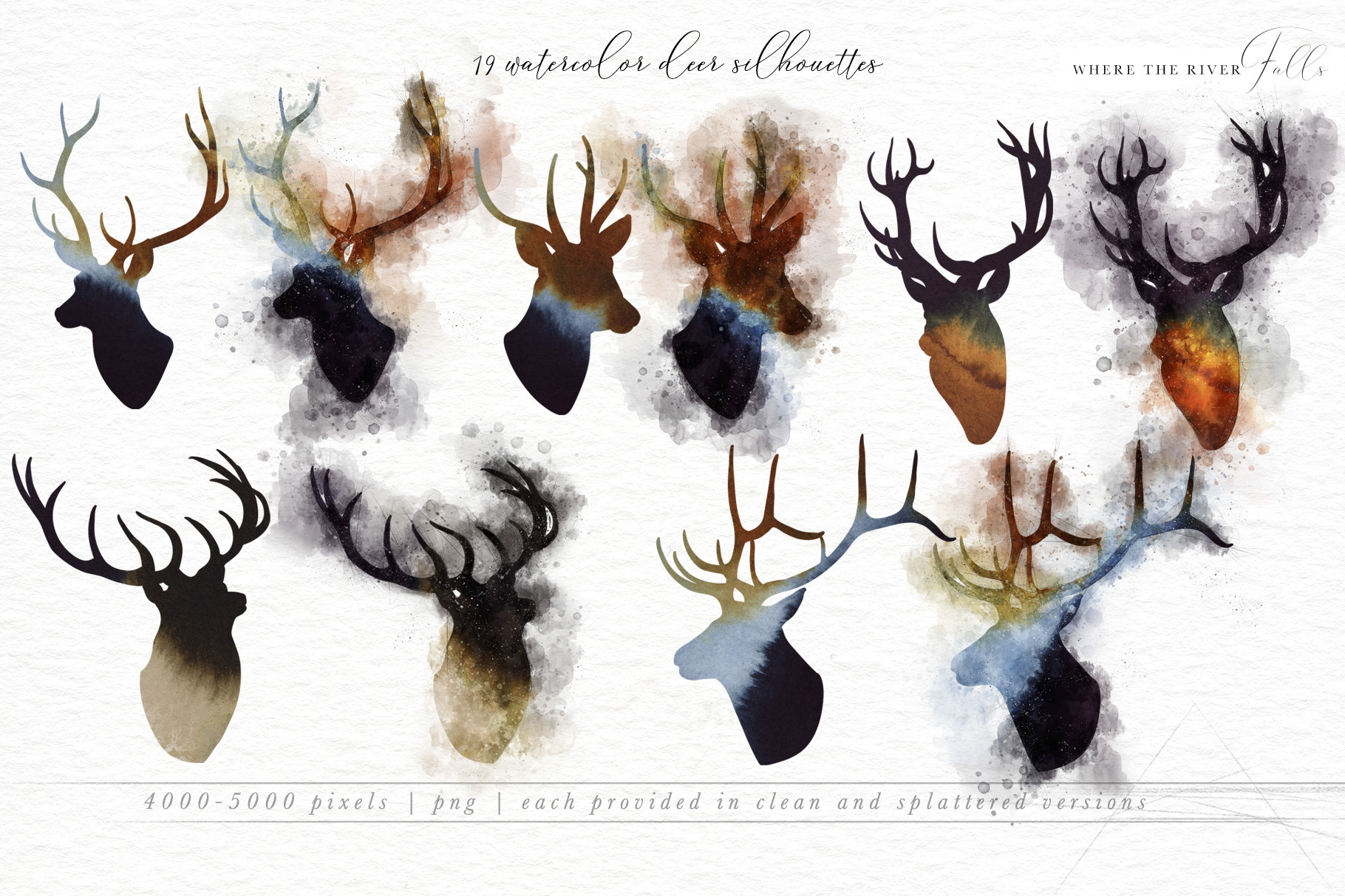 Included in this set: • 19 Watercolor Deer Illustrations • 4 Watercolor Bear Illustrations • 5 Watercolor Eagle Illustrations • 5 Watercolor Wolf & Fox Illustrations • 4 Watercolor Elk & Moose Illustrations • 7 Watercolor Branch Illustrations • 1 Watercolor Treeline Illustration • 3 Watercolor Moon Illustrations • 27 Watercolor Monograms – A-Z + Ampersand • 10 Watercolor Deer Head Collages • 4 Watercolor Washes • 19 Deer Silhouettes • 4 Bear Silhouettes • 5 Eagle Silhouettes • 5 Wolf & Fox Silhouettes • 4 Elk & Moose Silhouettes • 7 Branch Silhouettes • 1 Treeline Silhouettes
