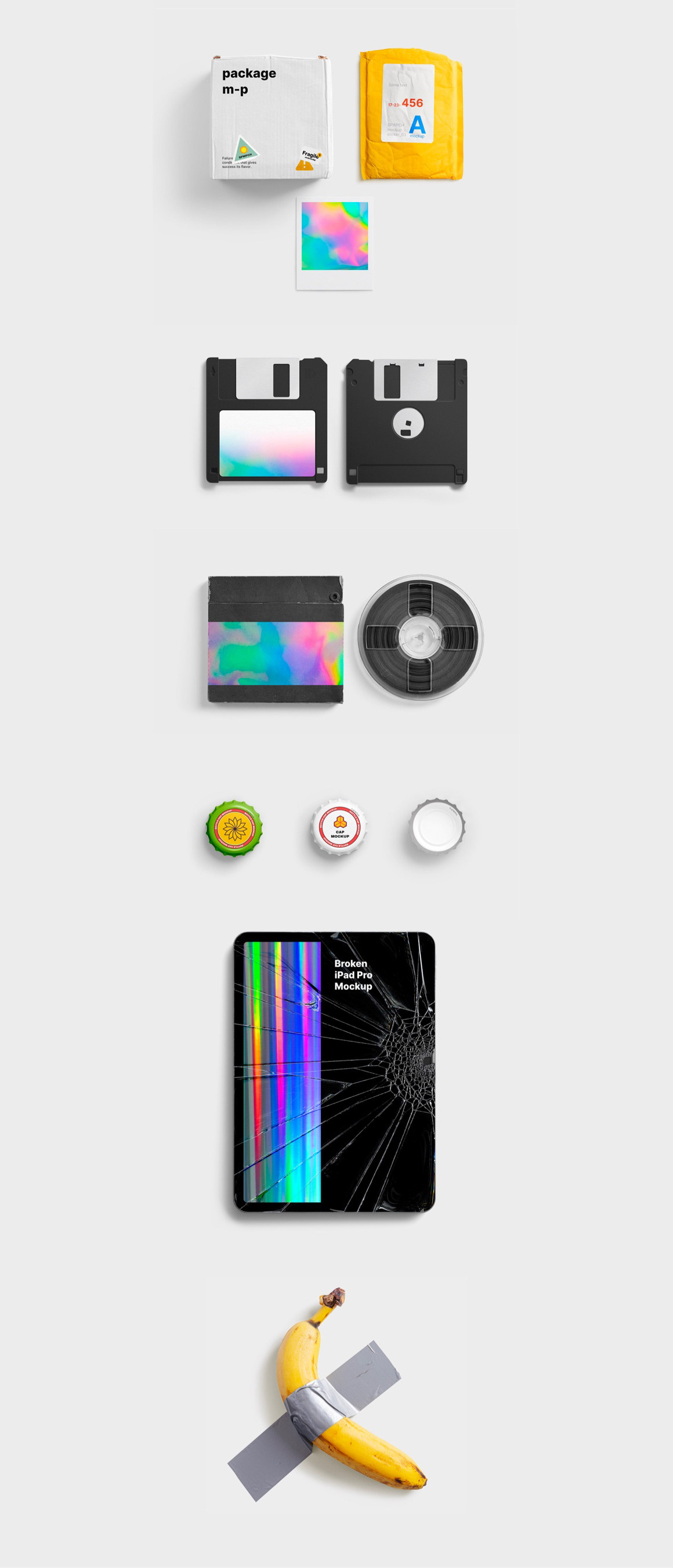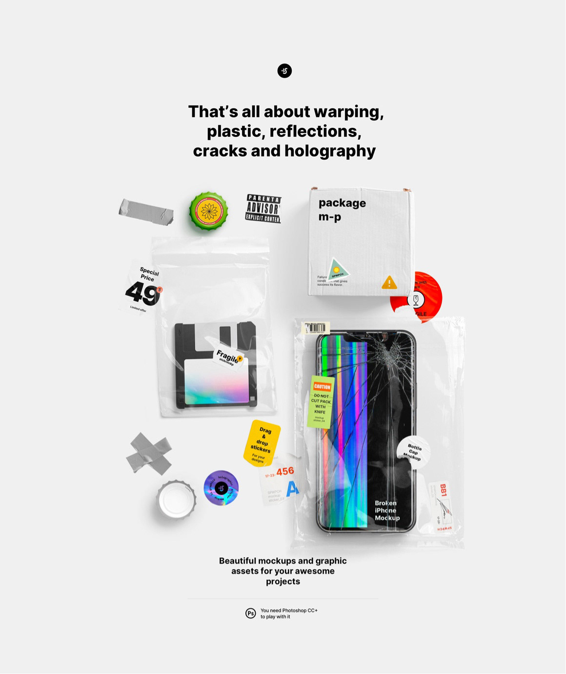 That’s all about warping, plastic, reflections, cracks and holography. Beautiful mockups and graphic assets for your awesome projects.